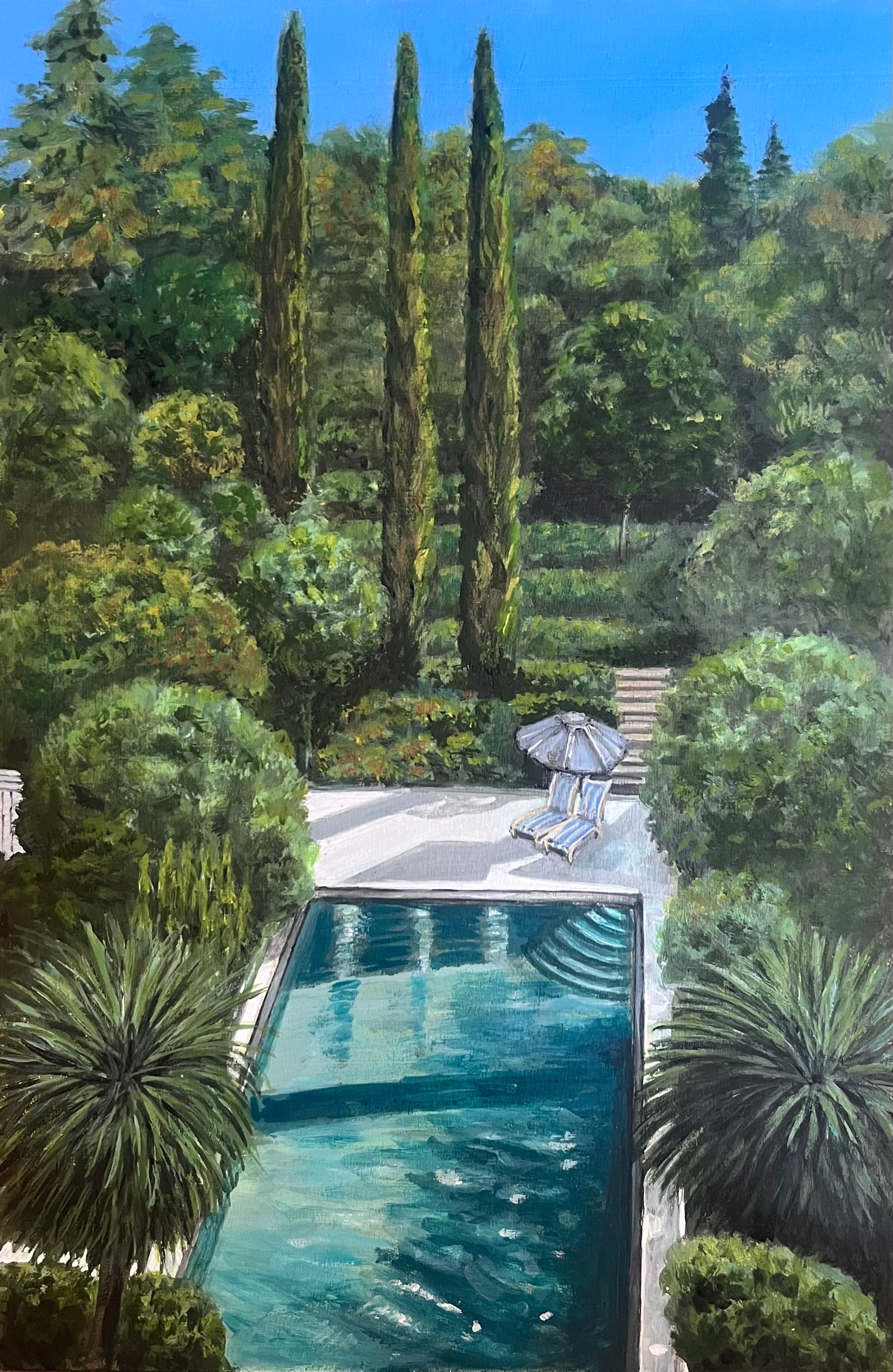 Original signed acrylic painting of a peaceful pool surrounded by a lush garden.